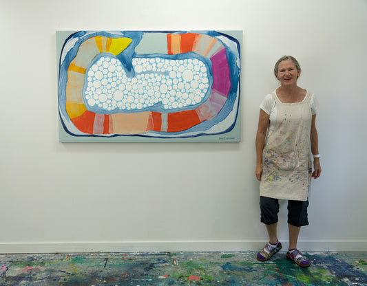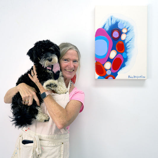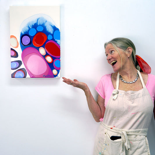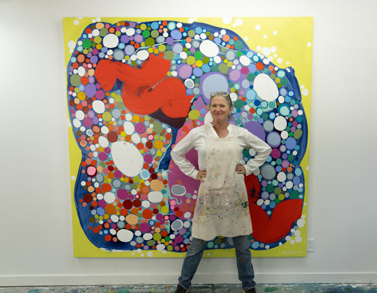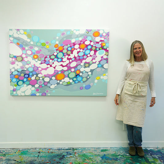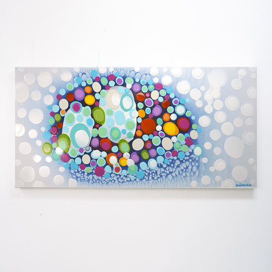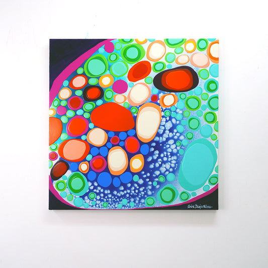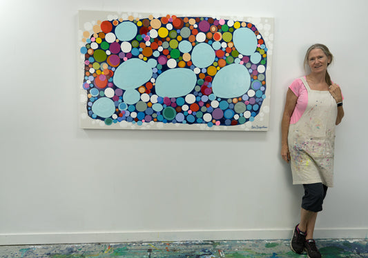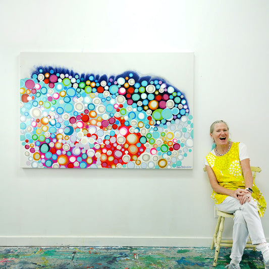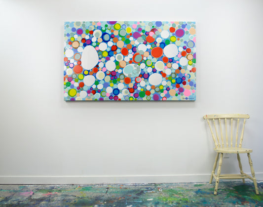 Dot by dot, layer by layer, these paintings come alive with energy and movement. The process of creating this series is contemplative—each dot or mark added with intention, forming a composition that feels both spontaneous and meticulously placed. The result is a dynamic, lively effect, much like the fizz of a just-poured glass of champagne. These pieces exude a playful vibrancy, capturing the joy of lightness, movement, and the little bubbles of happiness in life.