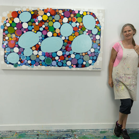 Dot by dot, layer by layer, these paintings come alive with energy and movement. The process of creating this series is contemplative—each dot or mark added with intention, forming a composition that feels both spontaneous and meticulously placed. The result is a dynamic, lively effect, much like the fizz of a just-poured glass of champagne. These pieces exude a playful vibrancy, capturing the joy of lightness, movement, and the little bubbles of happiness in life.