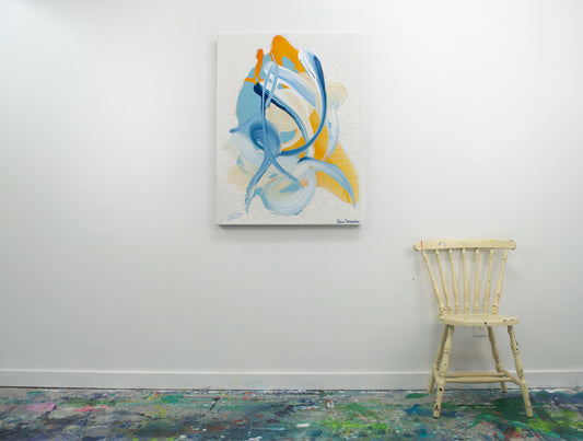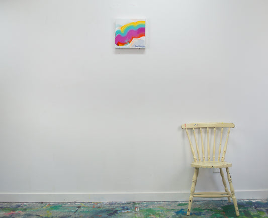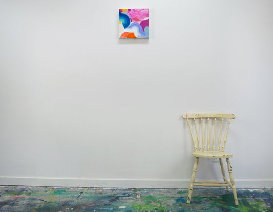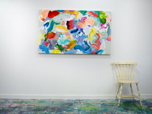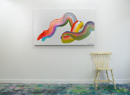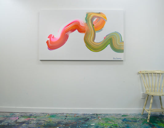 There’s no holding back in VAVOOM!—this is a collection that celebrates the joy of bold color, thick paint, and expressive movement. Broad brushstrokes drag vibrant hues across the canvas, creating a dynamic interplay of texture and saturation. Each layer interacts with the one before it, resulting in a lively, almost kinetic energy. These paintings don’t sit quietly in a room; they command attention, exuding confidence and excitement. They are about movement, expression, and the sheer pleasure of painting with abandon.