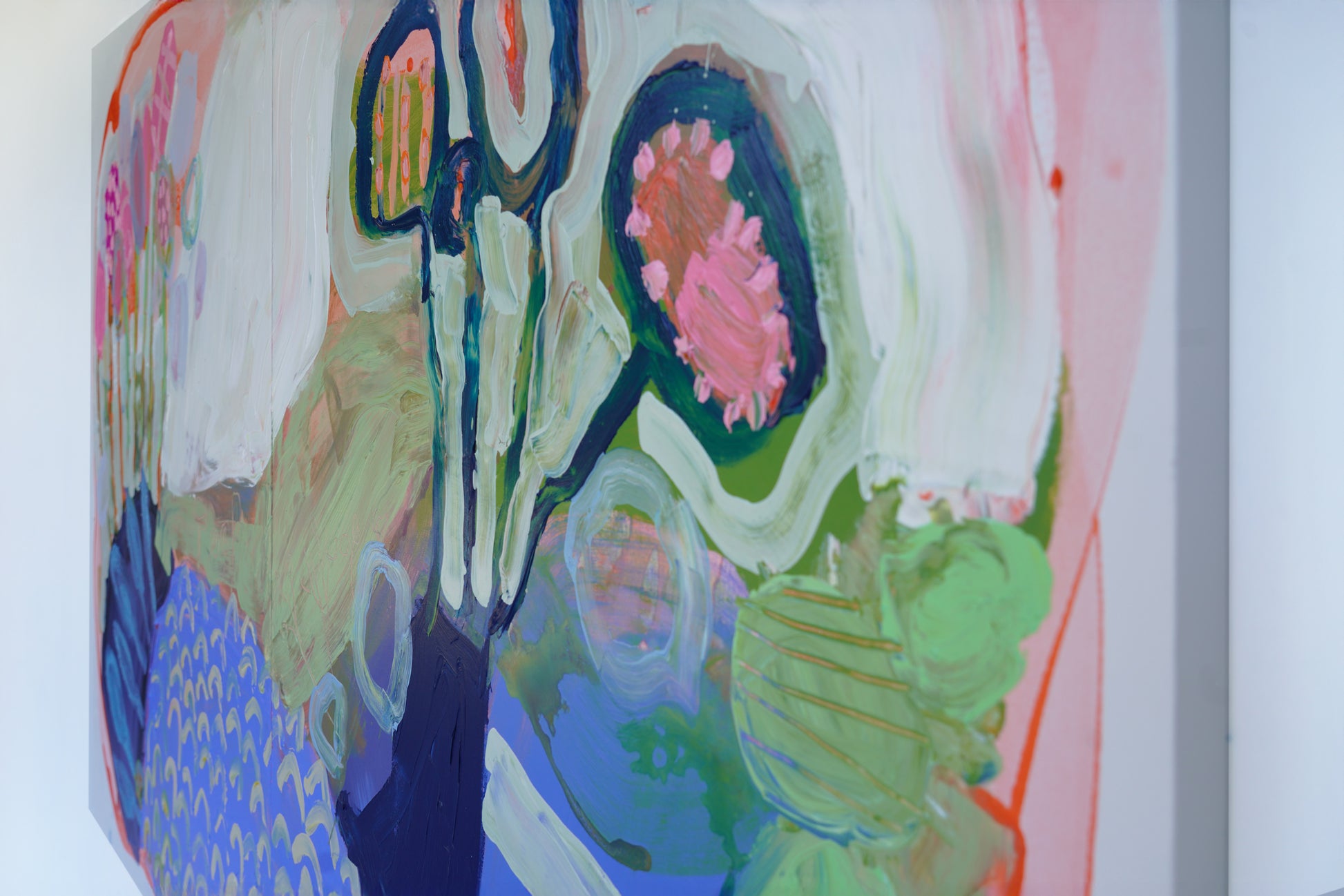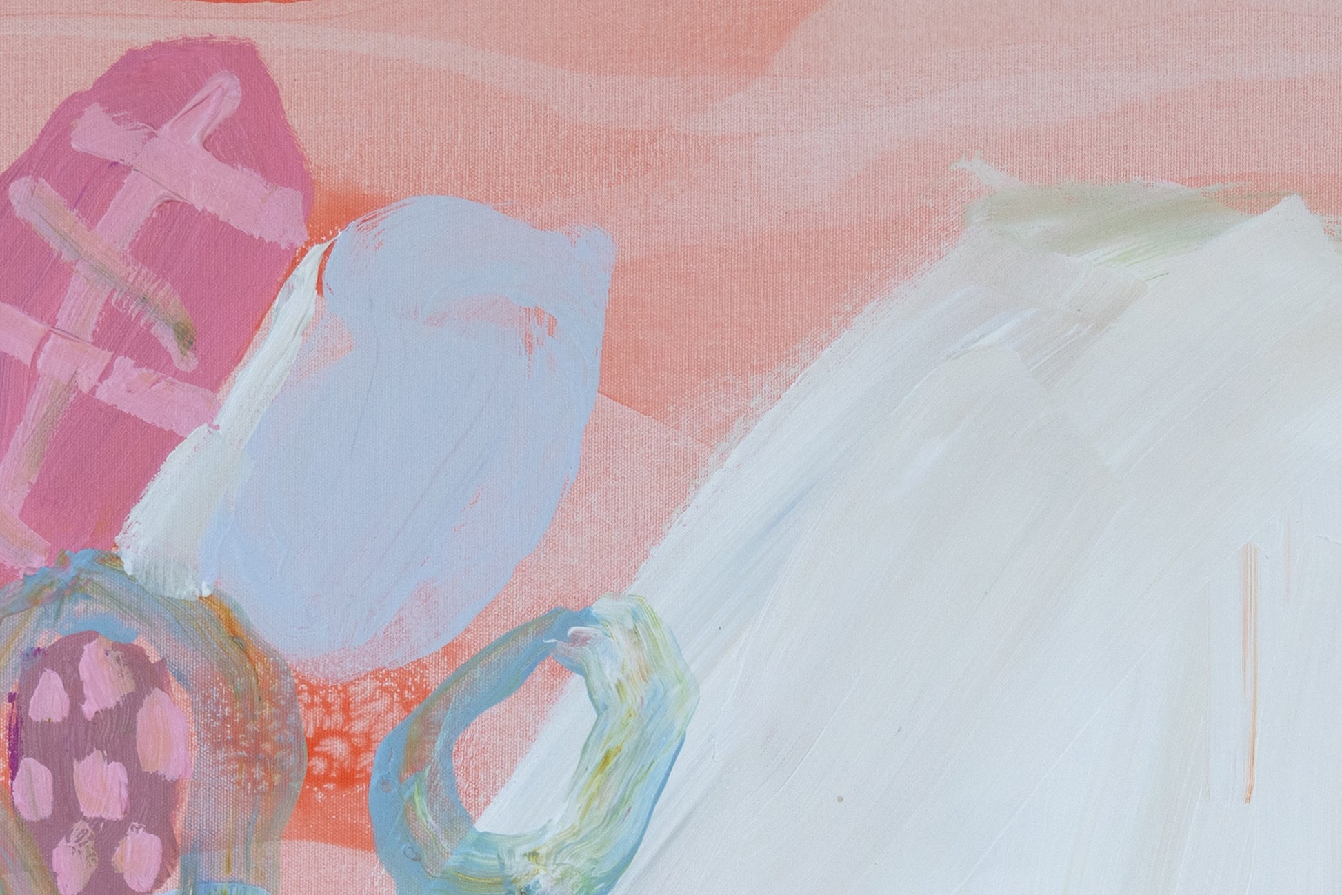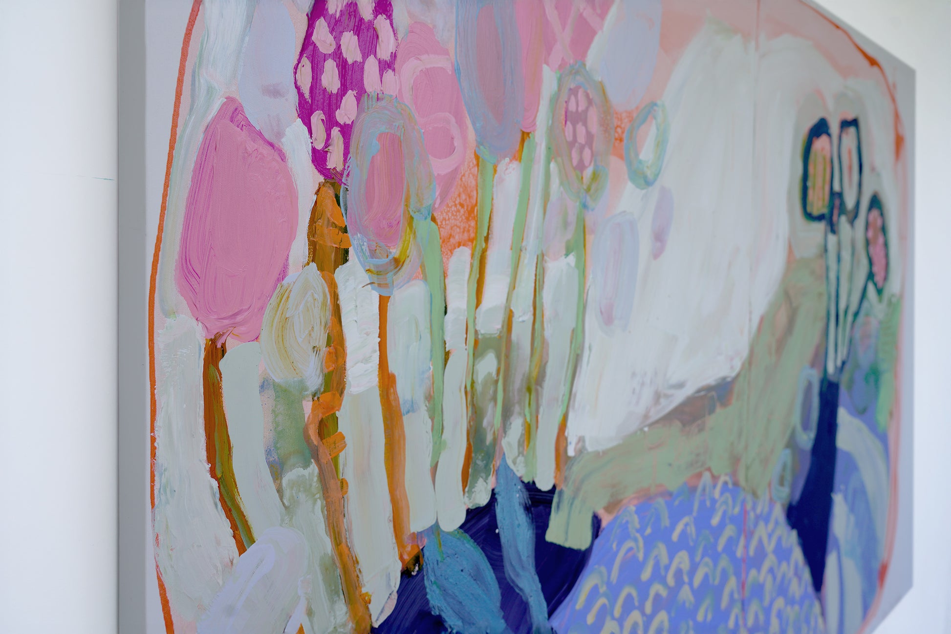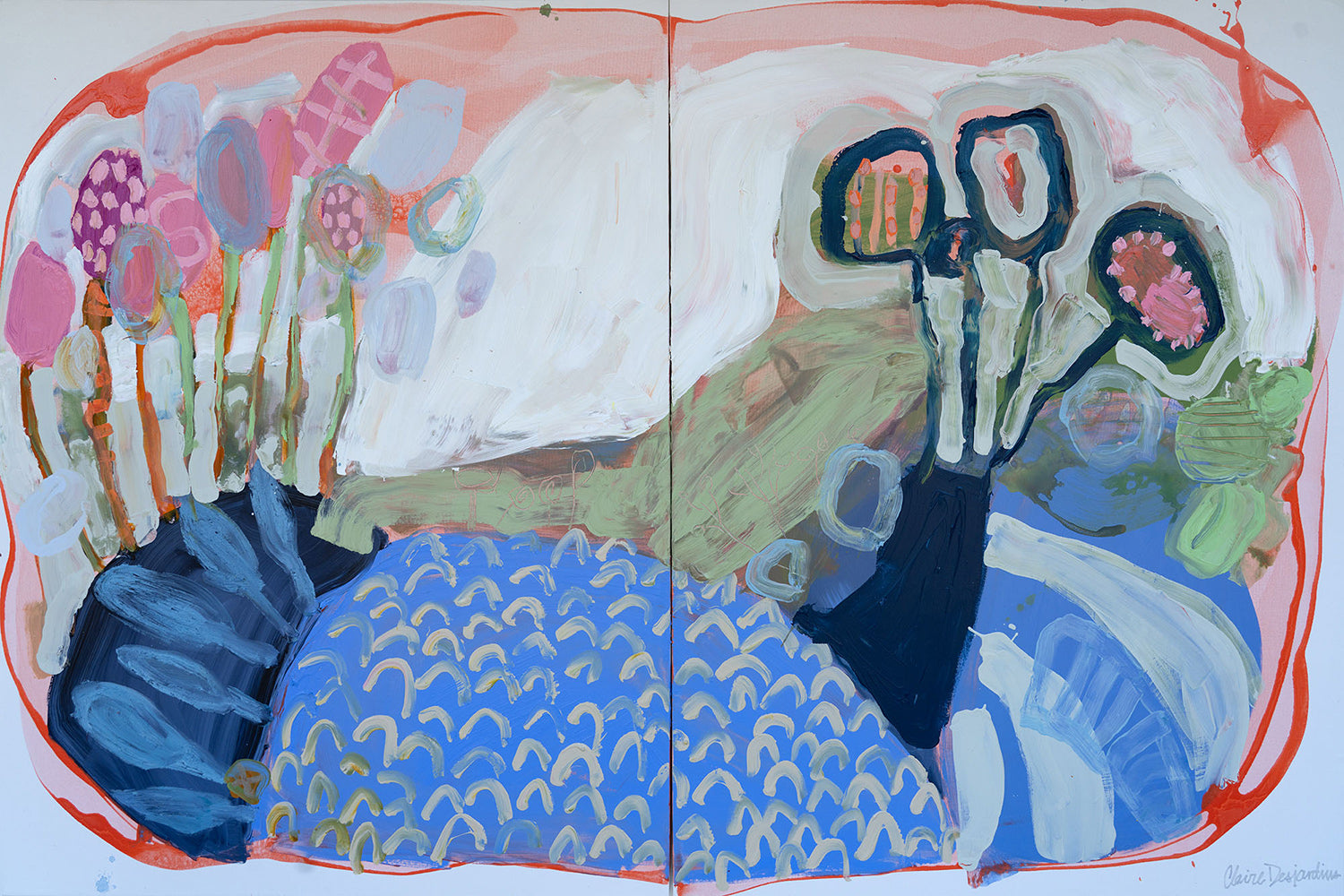 Garden by the Sea is a large-scale diptych that leans into looseness and play. I worked with soft pinks, greens, blues, whites, and greys, letting the colors move freely across the two panels. I wanted the painting to feel lighthearted and intuitive, almost like following a child’s way of seeing — curious, unfiltered, and unburdened.