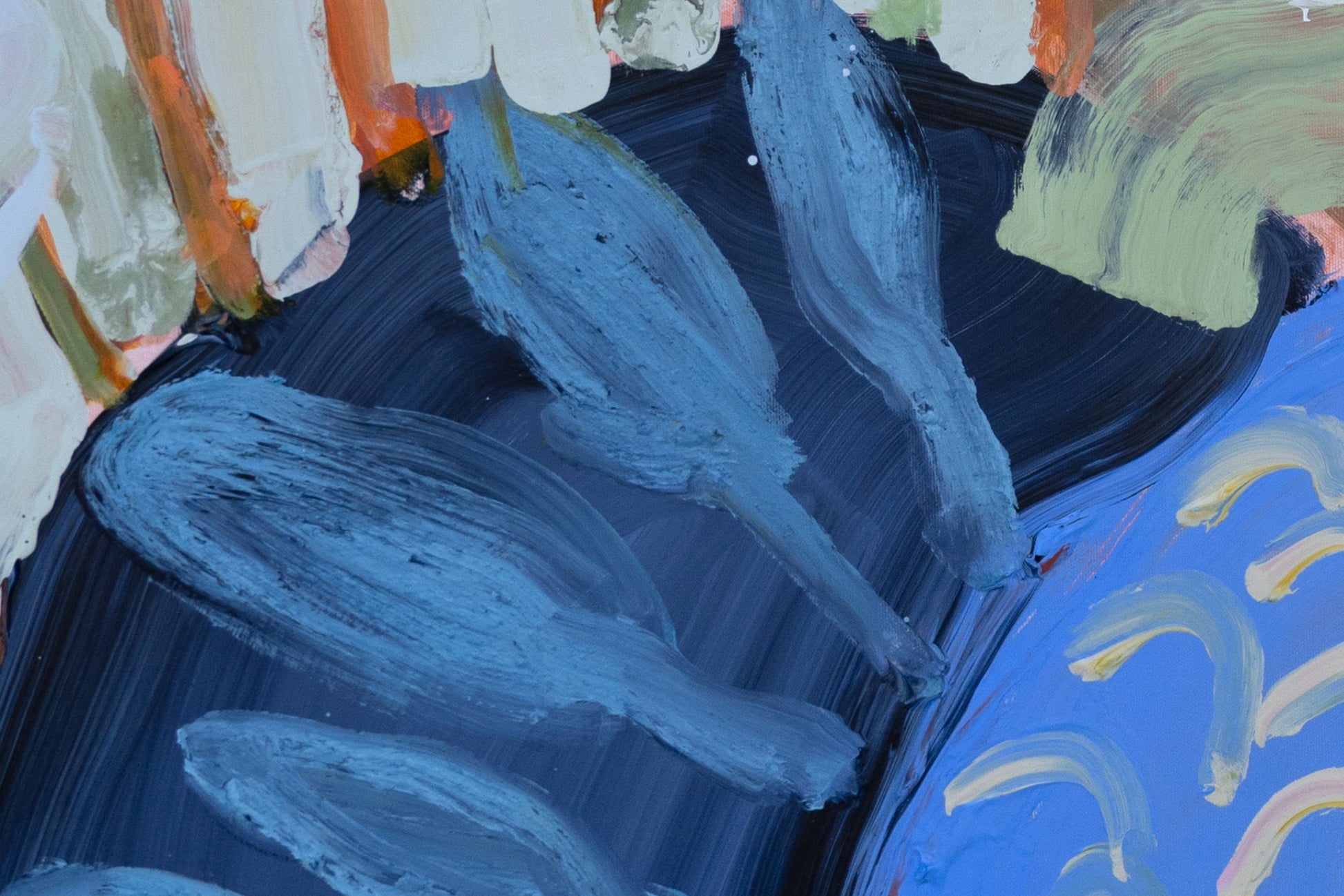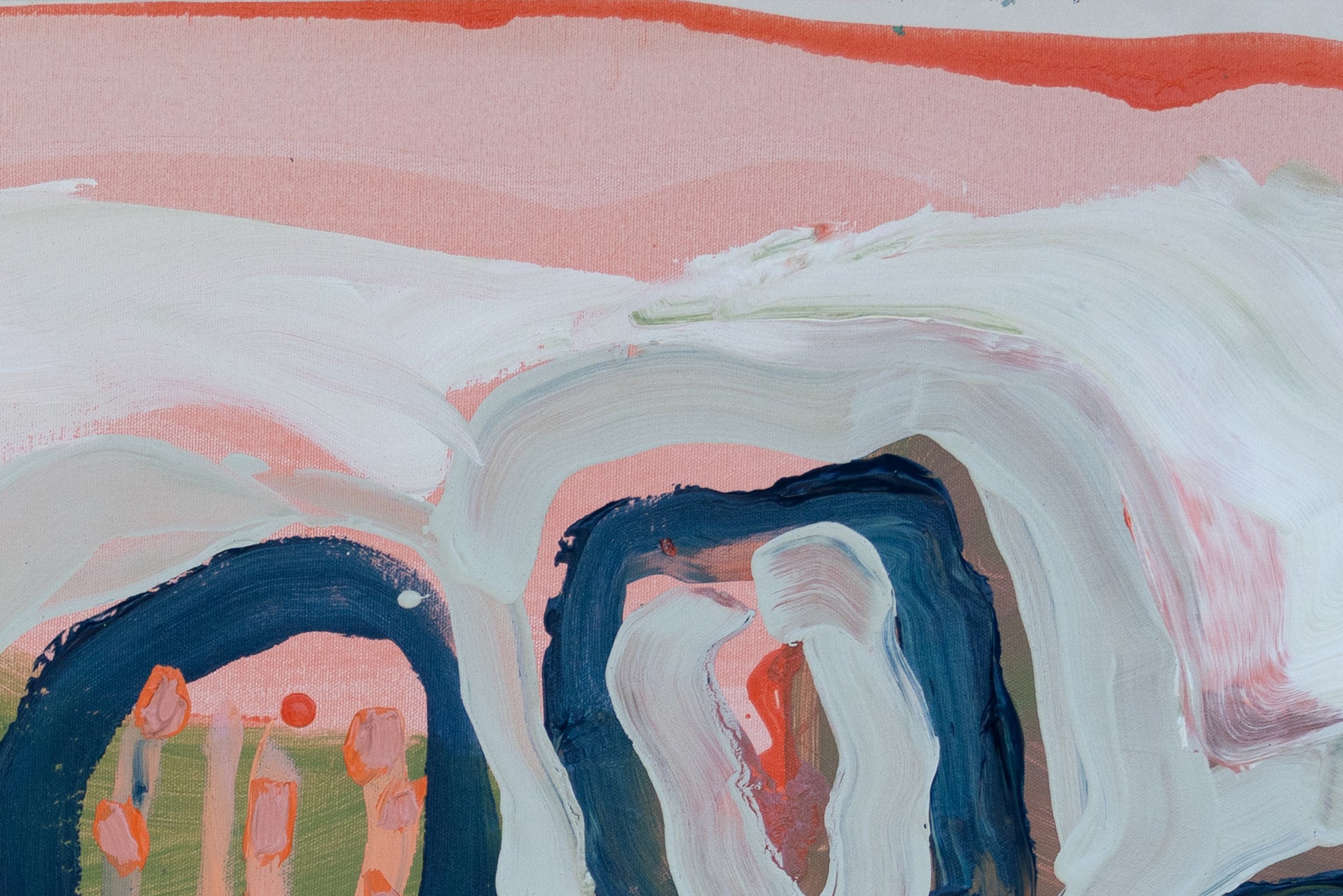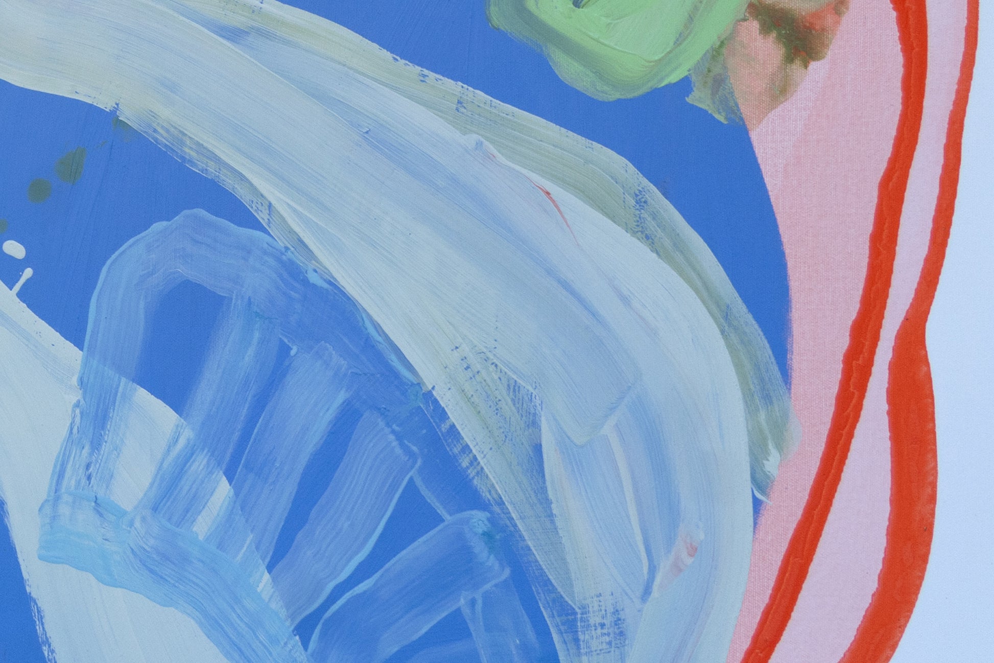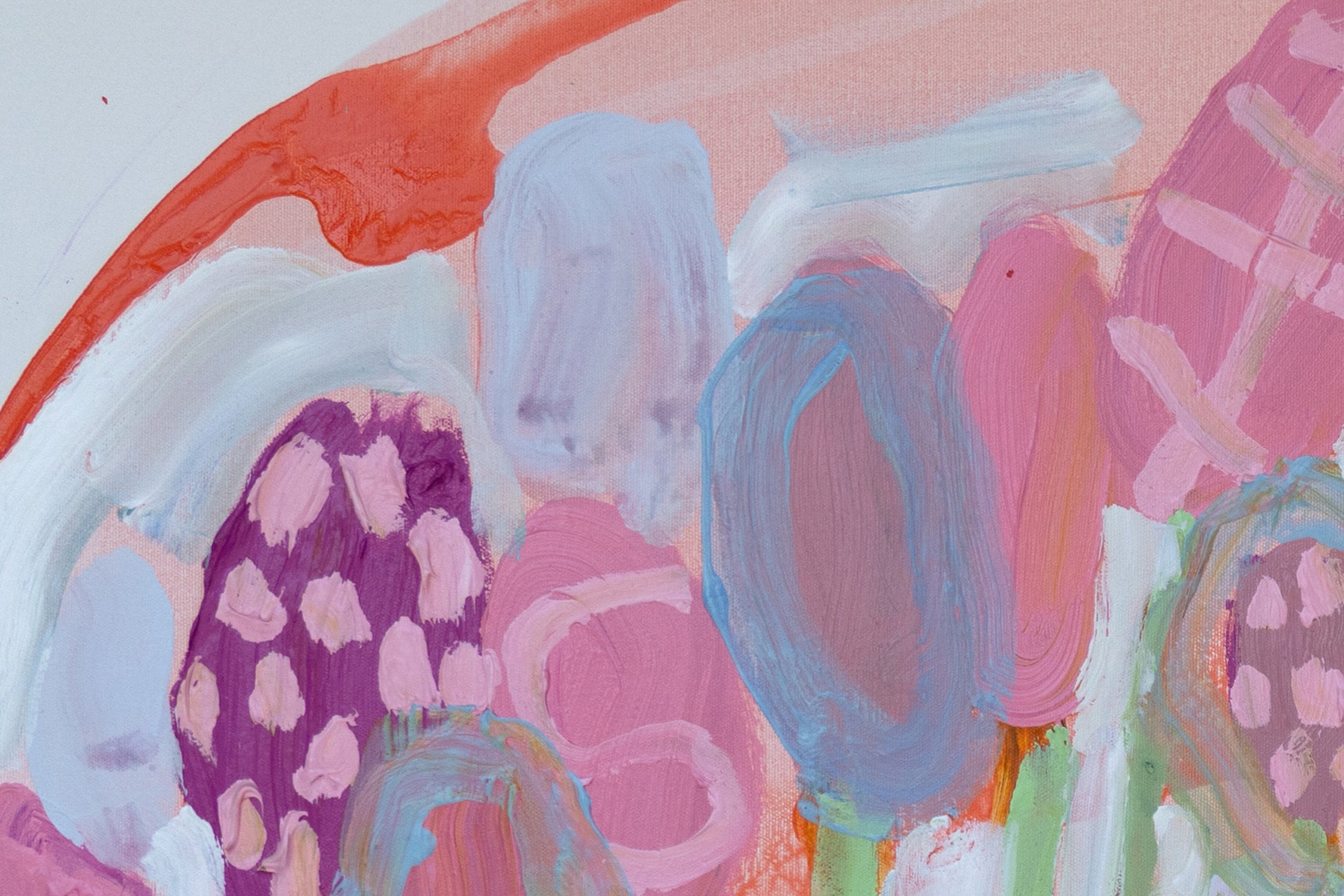Garden by the Sea is a large-scale diptych that leans into looseness and play. I worked with soft pinks, greens, blues, whites, and greys, letting the colors move freely across the two panels. I wanted the painting to feel lighthearted and intuitive, almost like following a child’s way of seeing — curious, unfiltered, and unburdened.
