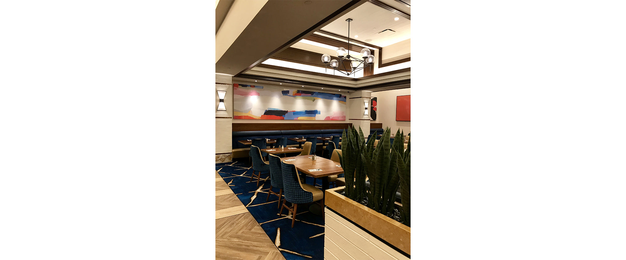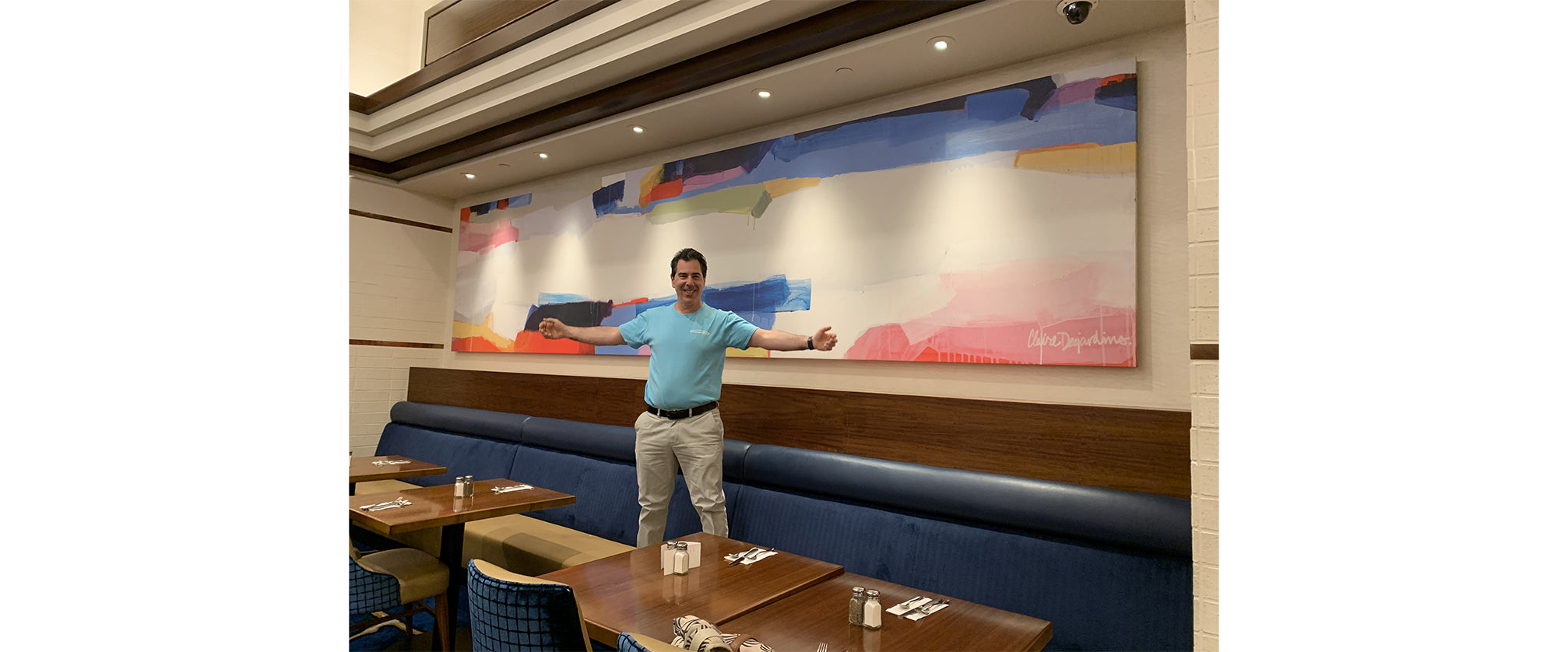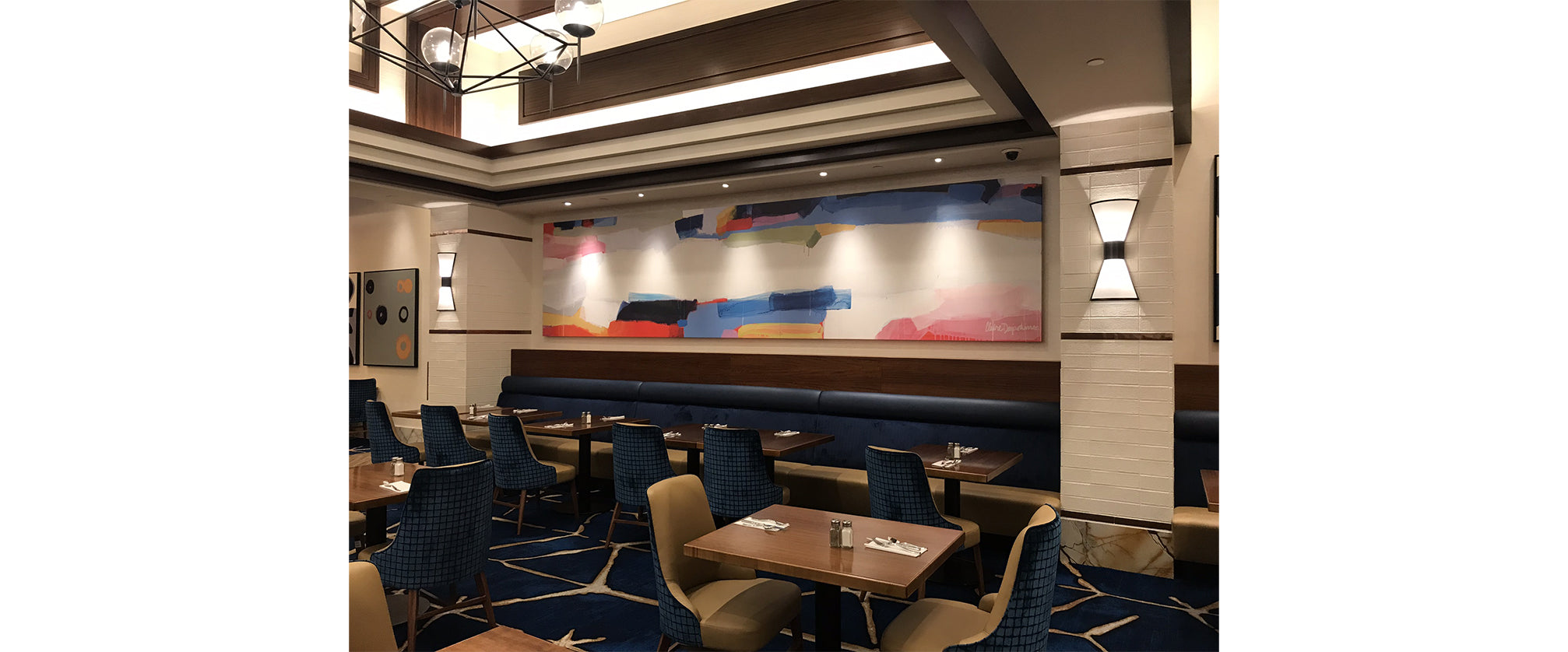 The result was a 22-foot-long print on canvas, based on one of my original paintings. It now hangs above the seating area, spanning nearly the entire back wall of the restaurant. Well-lit and impossible to miss, the piece needed to hold its own in a setting full of motion, color, and activity.