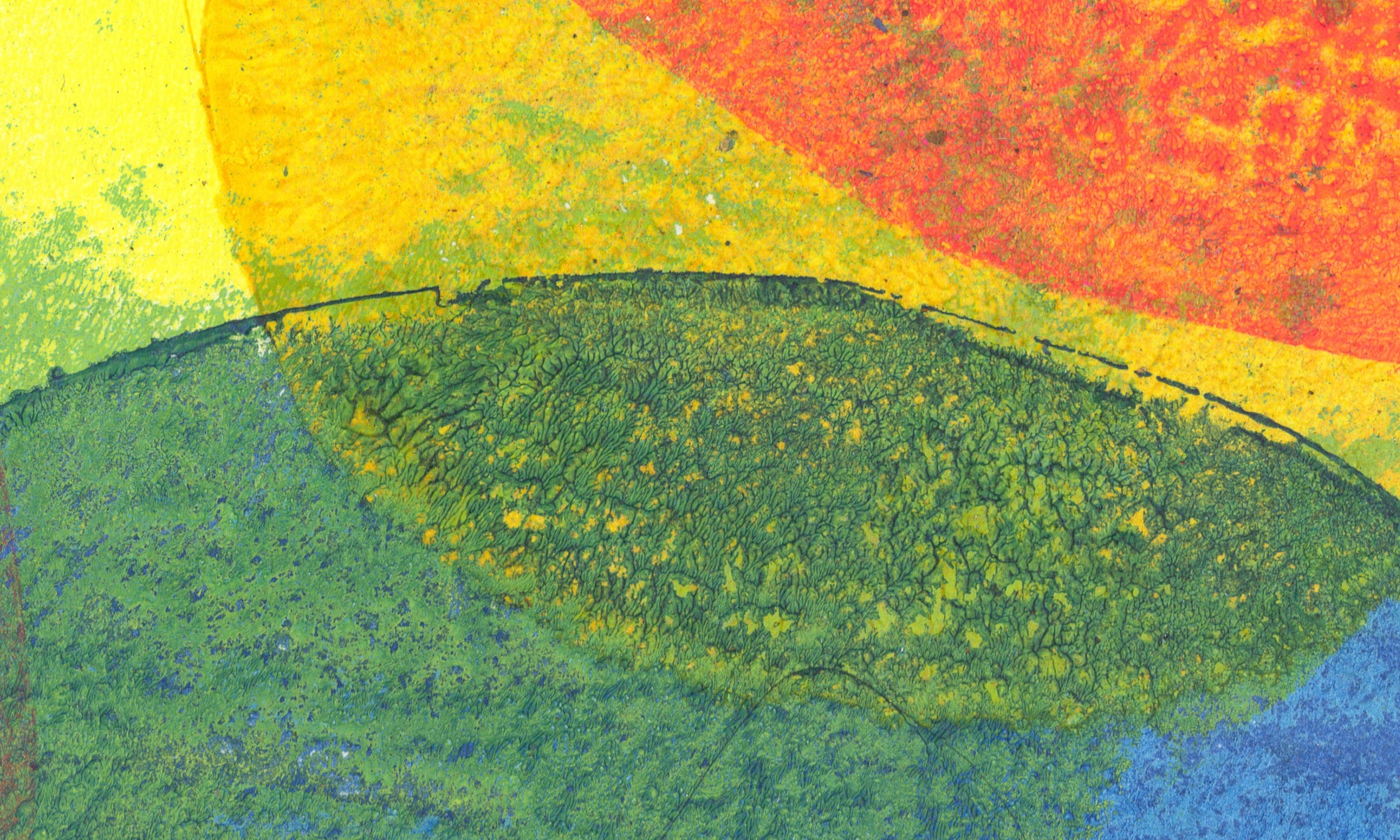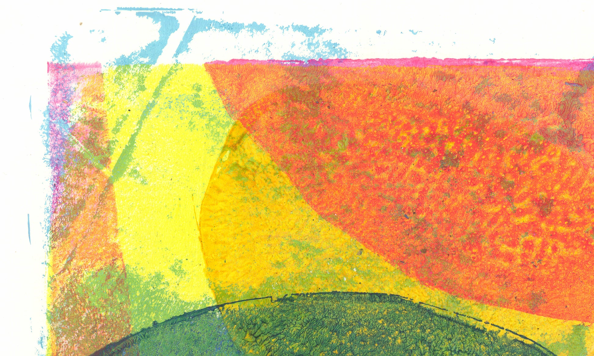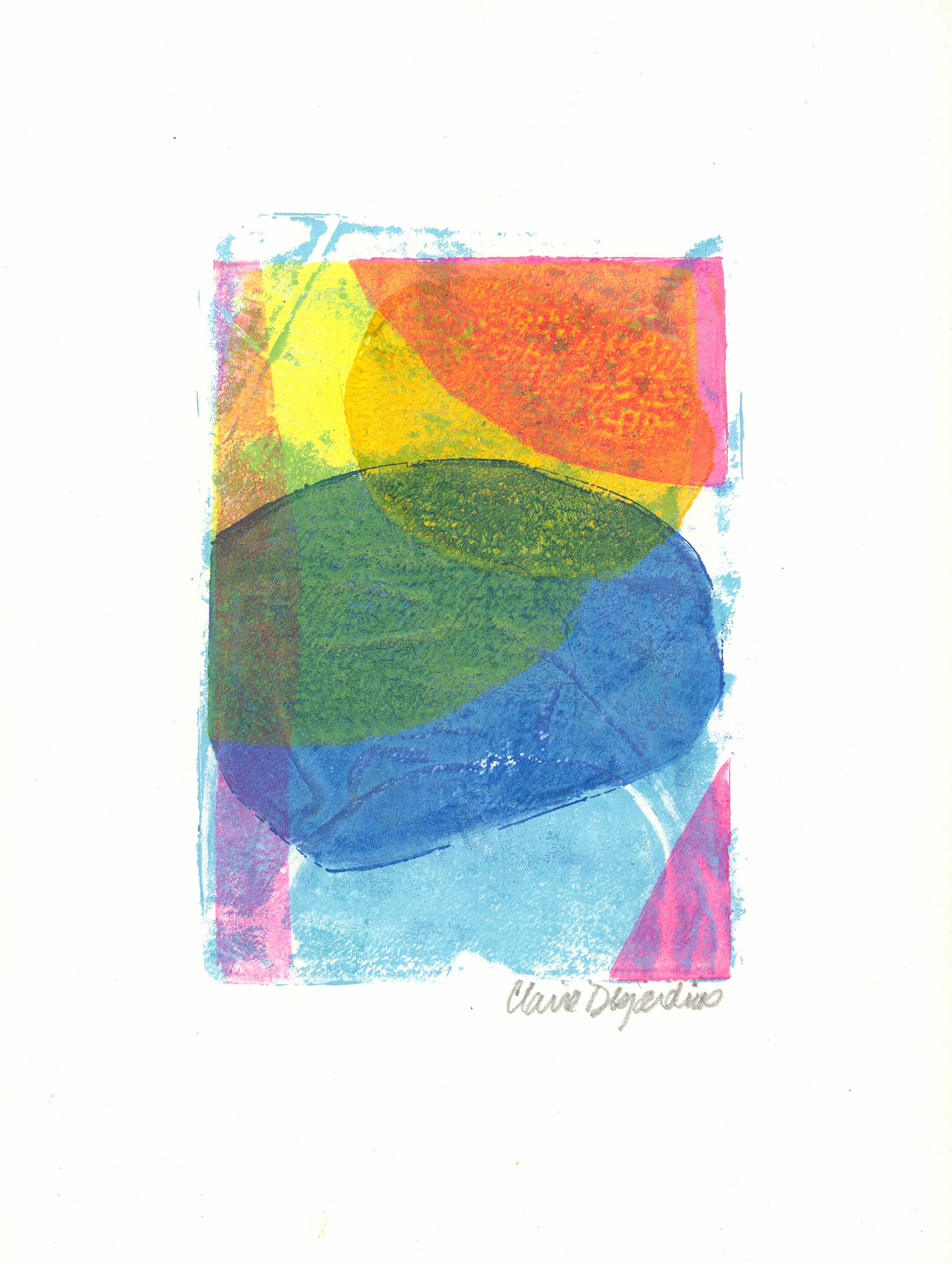 Each piece in OFFSET is a one-of-a-kind gel plate print on 300 lb, 100% cotton rag, acid-free watercolor paper. Signed in graphite, the works highlight the tactile qualities of the printing process: layers of paint press onto paper, producing subtle shifts in transparency and alignment. The edges of color rarely meet perfectly, giving each piece a soft, mid-century-inspired feel that balances structure with spontaneity.