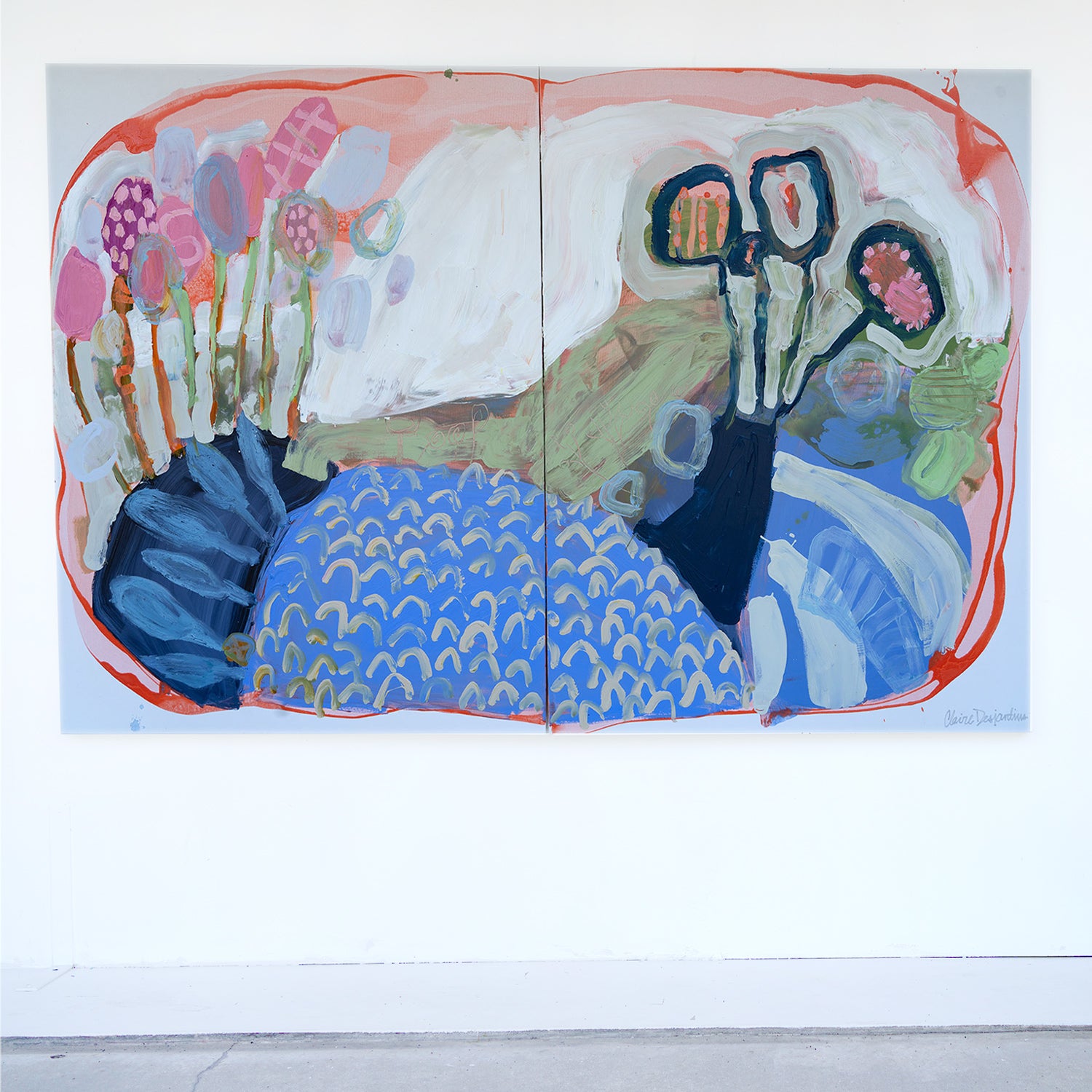 Garden by the Sea is a large-scale diptych that leans into looseness and play. I worked with soft pinks, greens, blues, whites, and greys, letting the colors move freely across the two panels. I wanted the painting to feel lighthearted and intuitive, almost like following a child’s way of seeing — curious, unfiltered, and unburdened.