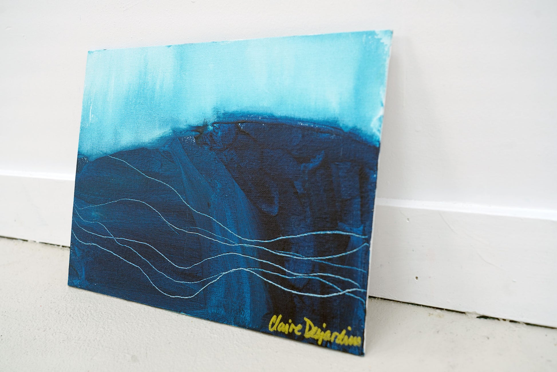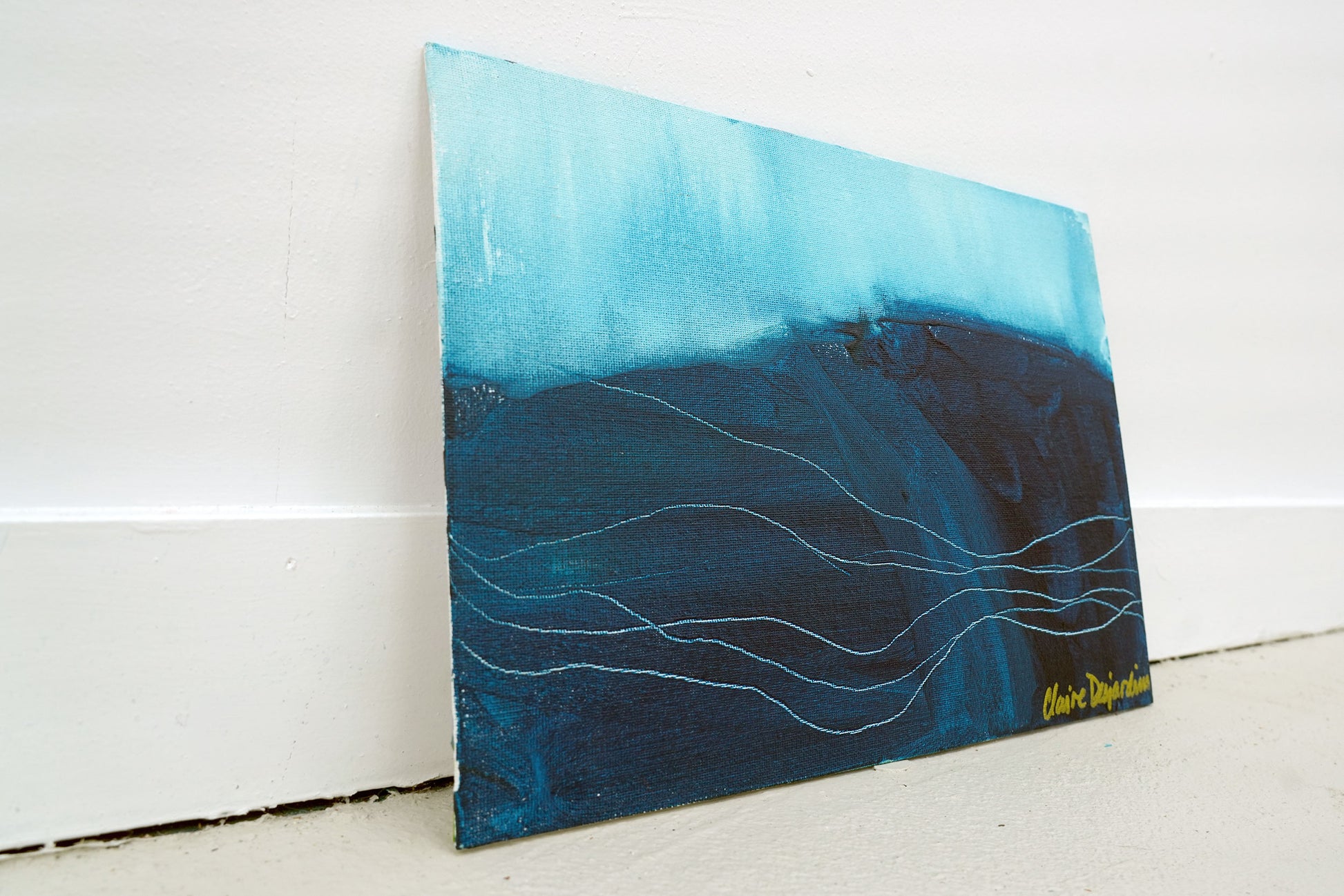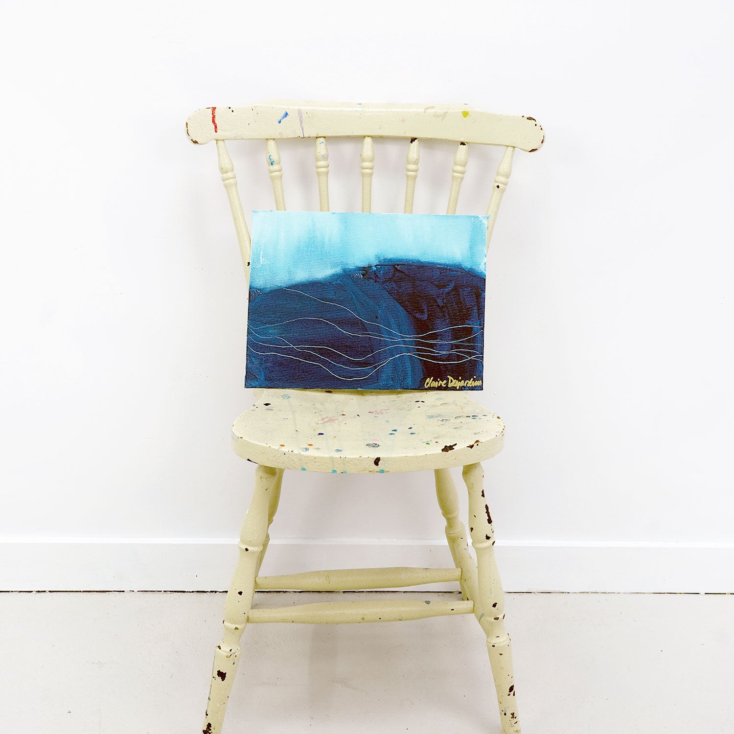 This small painting leans into darker, layered blues, built up thickly and then interrupted by fine scraped lines that suggest movement just out of view. Creating those marks felt instinctive, almost like tracing currents or hidden paths through the paint. The piece holds a sense of stillness, but also mystery—a reminder of how vast and unknowable the ocean can feel when you are surrounded by it on all sides.