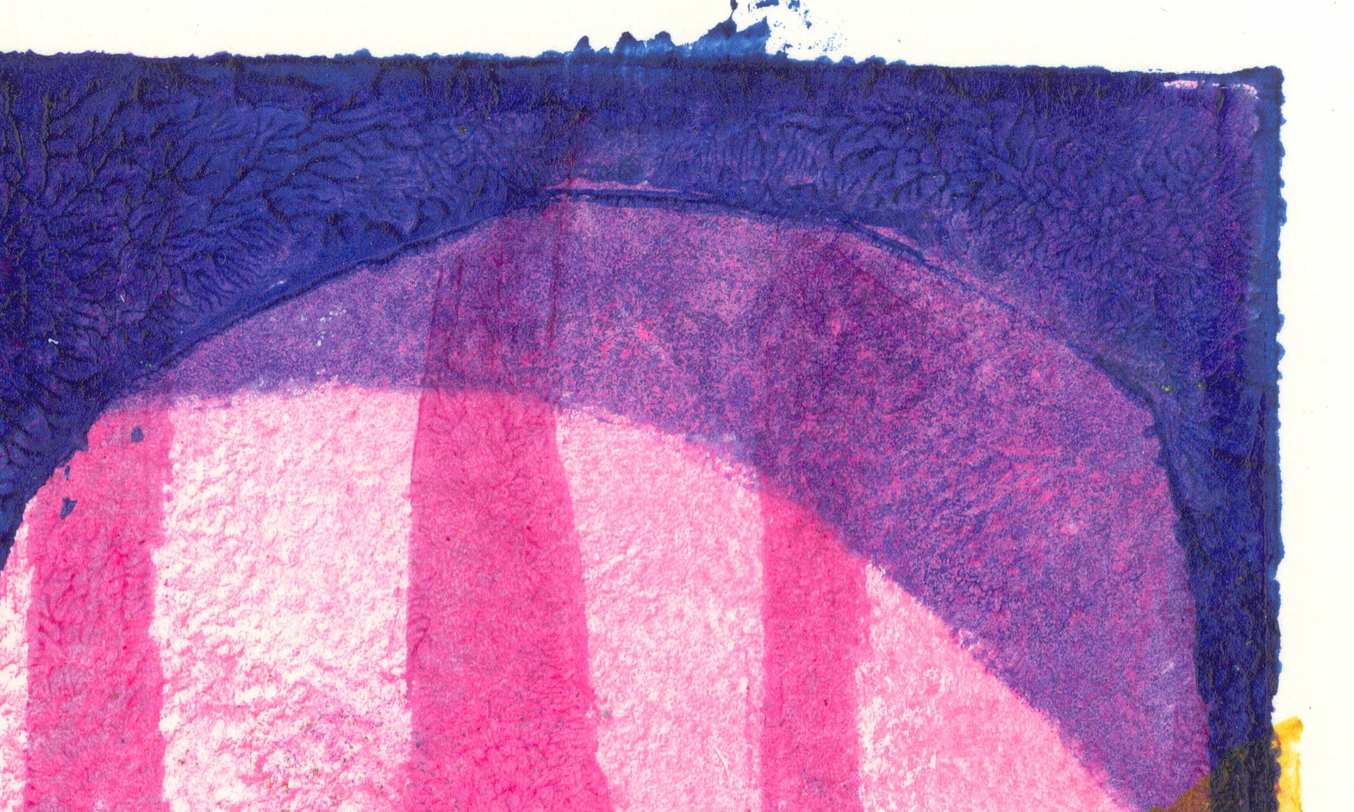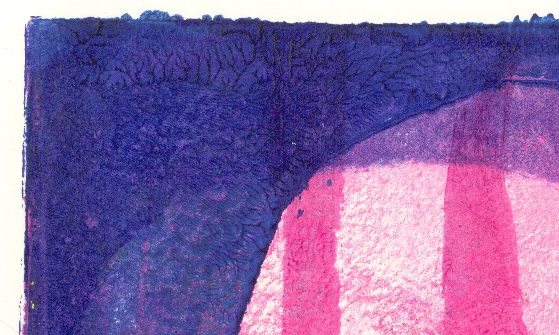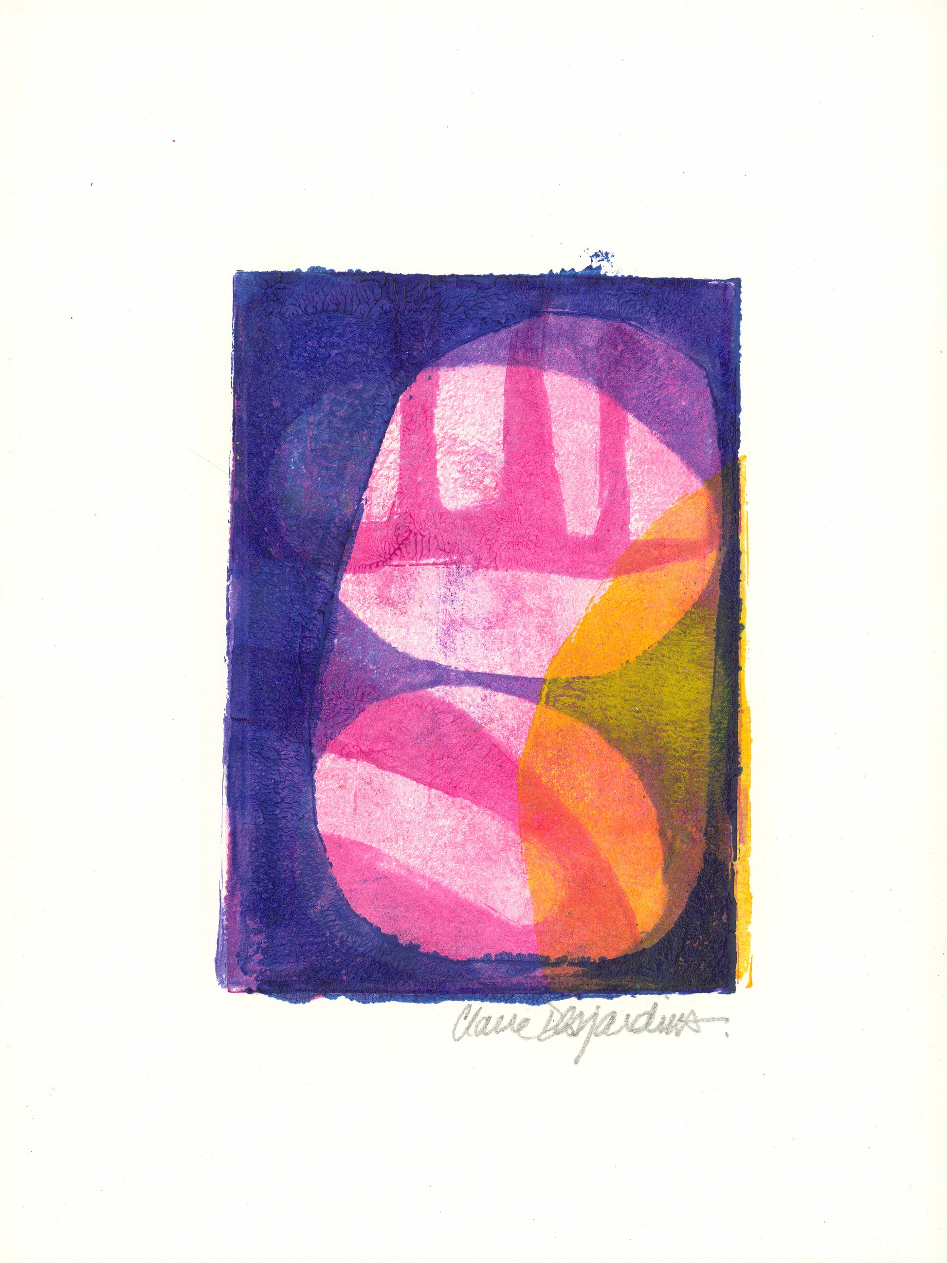 Each piece in OFFSET is a one-of-a-kind gel plate print on 300 lb, 100% cotton rag, acid-free watercolor paper. Signed in graphite, the works highlight the tactile qualities of the printing process: layers of paint press onto paper, producing subtle shifts in transparency and alignment. The edges of color rarely meet perfectly, giving each piece a soft, mid-century-inspired feel that balances structure with spontaneity.
