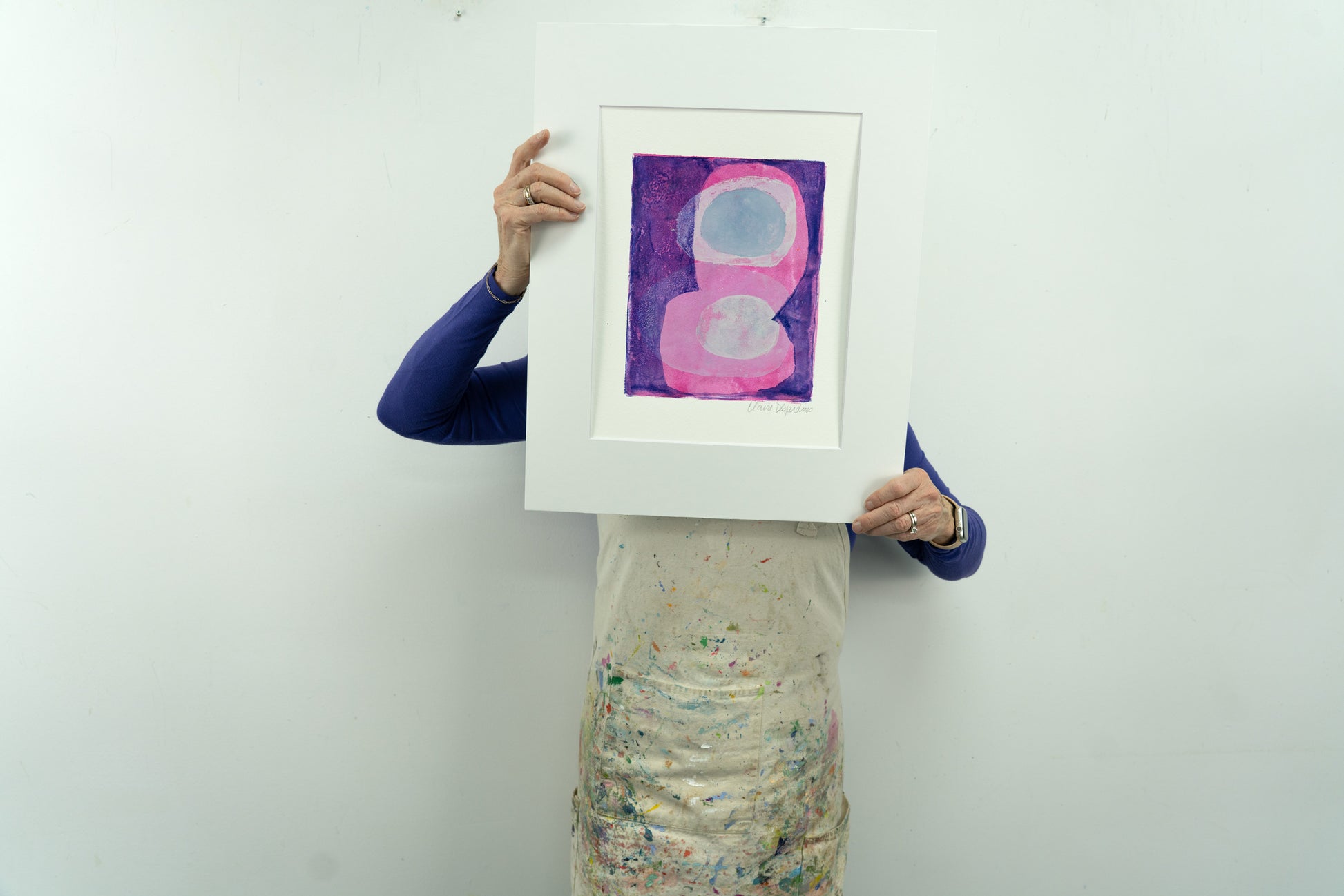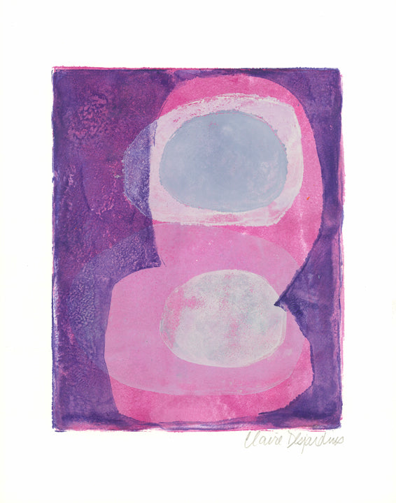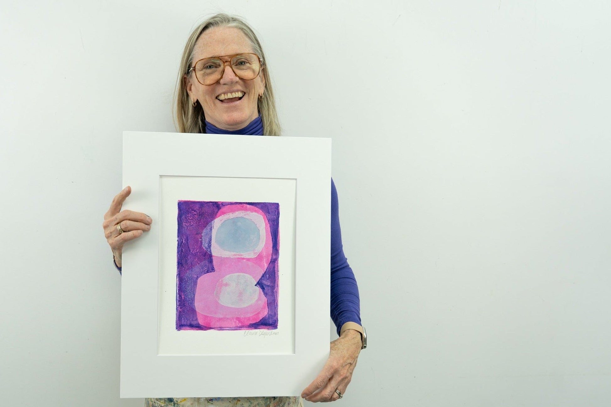 Each piece in OFFSET is a one-of-a-kind gel plate print on 300 lb, 100% cotton rag, acid-free watercolor paper. Signed in graphite, the works highlight the tactile qualities of the printing process: layers of paint press onto paper, producing subtle shifts in transparency and alignment. The edges of color rarely meet perfectly, giving each piece a soft, mid-century-inspired feel that balances structure with spontaneity.