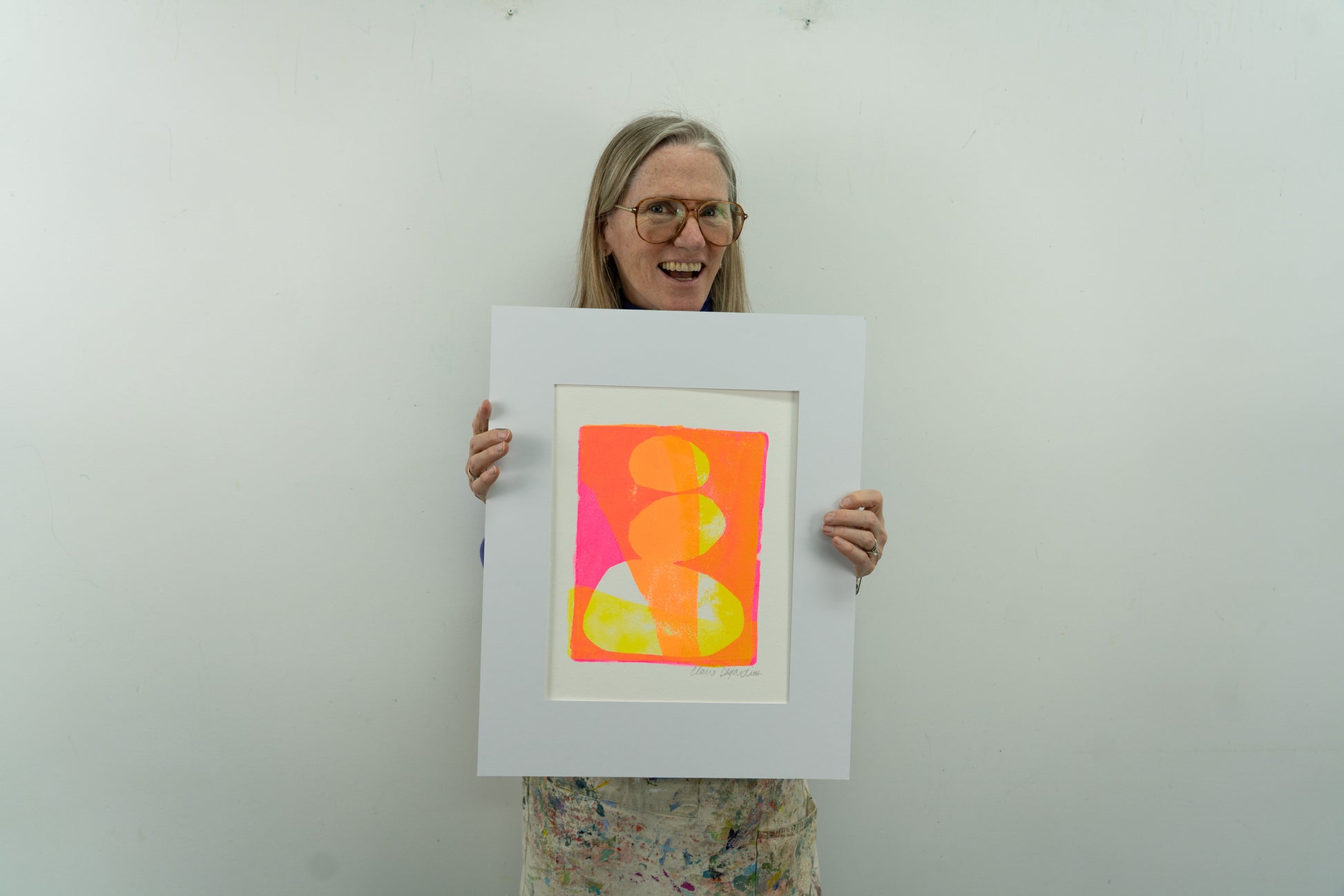 Each piece in OFFSET is a one-of-a-kind gel plate print on 300 lb, 100% cotton rag, acid-free watercolor paper. Signed in graphite, the works highlight the tactile qualities of the printing process: layers of paint press onto paper, producing subtle shifts in transparency and alignment. The edges of color rarely meet perfectly, giving each piece a soft, mid-century-inspired feel that balances structure with spontaneity.