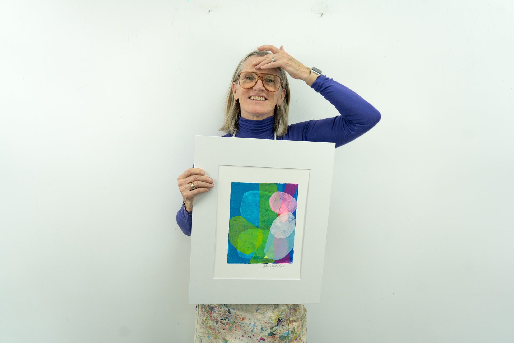 Each piece in OFFSET is a one-of-a-kind gel plate print on 300 lb, 100% cotton rag, acid-free watercolor paper. Signed in graphite, the works highlight the tactile qualities of the printing process: layers of paint press onto paper, producing subtle shifts in transparency and alignment. The edges of color rarely meet perfectly, giving each piece a soft, mid-century-inspired feel that balances structure with spontaneity.